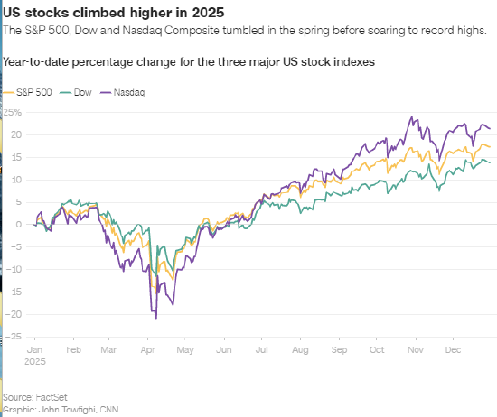 标普 500 指数 2025 年涨幅将达 17%,而 2024 年、2023 年该指数涨幅分别为 23% 和 24%。尽管全年市场担忧关祱政策、地缘政治动荡、资产泡沫风险,还遭遇了美国历史上历时最长的政府停摆危机,美股仍斩获亮眼涨幅。